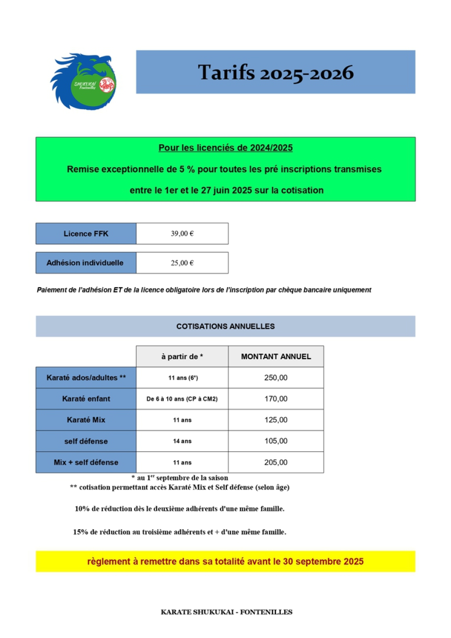 ● Le règlement de la licence FFK (39€) et de l'adhésion au club (25€)